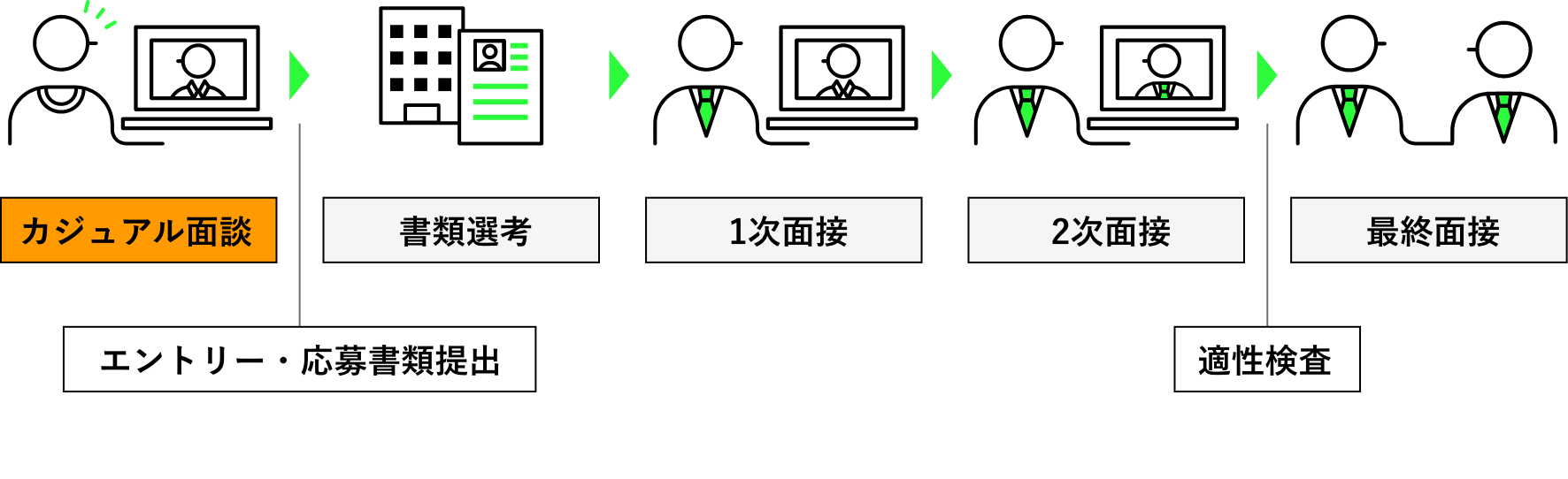 - カジュアル面談、1次、2次面接はオンラインでの実施となります。