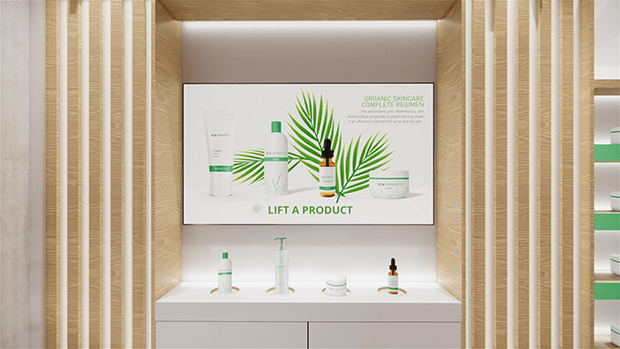 化粧品や雑貨、家電などの商品を手に取る際、その商品にあわせたコンテンツに切り替え、より効率的に商品理解を促進。