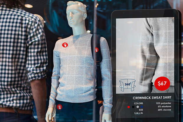 アパレル店舗でのVP展示等、センサーをタッチすることで、コーディネートや商品特徴を説明。