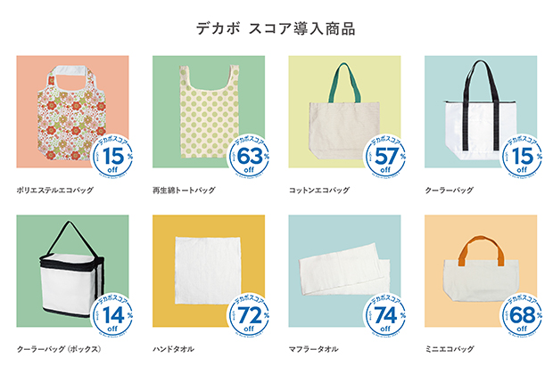 エコバッグやマルシェバッグなどの各種バッグ類や、タオル類など、デカボスコア付き製品をすぐに導入いただける各種ラインナップをご用意しております。
