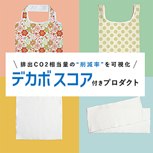 提供している販促品や販売品の原料や製造プロセスを脱炭素視点で見直し、従来の生産工程において排出されるCO2e(CO2相当量に換算した値)と比較した削減量を新たな指標で可視化する「デカボスコア付き製品」を提供。