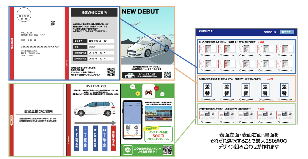 この「パーソナライズDMかんたん発送サービス」は、特に定期的な点検や登録内容の更新・変更等のご案内、顧客によって来店・更新の時期や購入商品・プランが異なる、ポイント制度などで異なる情報のお知らせなどを送付している企業に最適なサービスです。このようなご案内をDMとSMSに出し分ける業務をよりスムーズに行うことが可能となります。