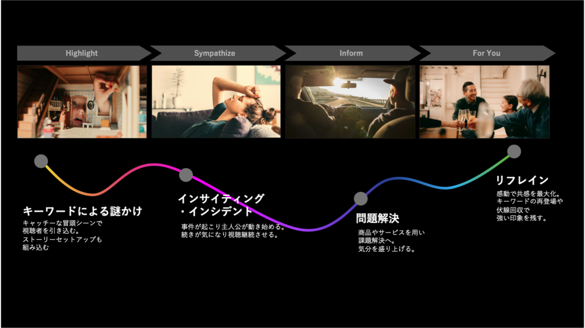 吉田:ストーリーテリングの手法は、これまで映画やドラマの脚本に活用されてきましたが、実は広告ではあまり活用されておらず、私たちはそれを長尺動画に積極的に取り入れて、さらに、時代性やトレンドも踏まえた構造に落とし込んでいくことにしました。