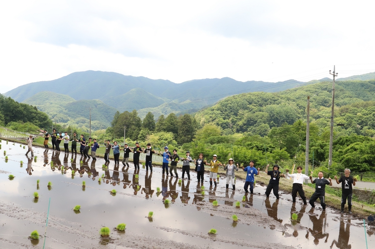 午後の作業は次第にコツを掴んだようで効率的に進んでいき、隣同士で和気あいあいとコミュニケーションを取りながら連携する様子がありました。隅まで農地を余すことなく苗を植え、ようやく終了!予定の時間よりも30分ほど短縮しました。力を合わせ、励まし合って効率的に作業を進める姿は博報堂グループのチームワークならでは。初めての手植えとは思えないほど綺麗に揃っており、NPOの皆さんも「さすがクリエイティブな会社ですね!」と太鼓判。心地よい疲労感と達成感に浸りながら、最後に曽根原さんお約束の「お田植えモリモリ!」の掛け声に合わせて記念写真を撮りました。