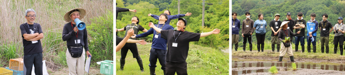 東京から約2時間30分移動して、バスを降りると深呼吸したくなるような爽やかな空気。どの方角を見ても山や草木の緑が美しく映えていました。編み笠をかぶったNPO法人えがおつなげて代表の曽根原さんが笑顔で出迎えてくれました。田植えは慣れない足場で腰を落とし続ける重労働ということで、バス移動で固まった身体を、山梨ならではの甲州弁ラジオ体操でほぐしていきます。ほとんどのメンバーが初めての田植え体験なので、曽根原さんから田植えのイロハを教わっていきます。