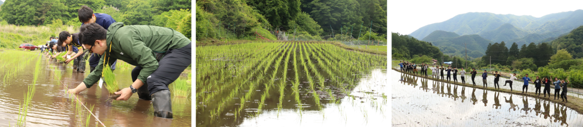 田植えは苗を植える間隔や1株に植える苗の本数などのポイントを伺い、効率的に作業を進めるために、目印がついたひもを両端からぴんと張って、等間隔に植えていきます。苗を3~4本束にしたものを、指で挟み、土に向かって垂直に植えていきます。苗は深く植えすぎてしまうと初期生育を阻害し、浅く植えすぎると苗が横に倒れてしまうため、絶妙な加減が難しい。慣れない田んぼのぬかるみに四苦八苦しながらも、1株ずつ丁寧に苗を植えていきます。3株分でようやくご飯1杯分になるとのこと、食べ物が私たちに届くまでの大変さを実感しました。午前中の作業を終え、田んぼの脇を流れる水路からの冷たい水で泥を落とし、のどかな田園風景に囲まれて食べる手作りのお弁当は格別です!