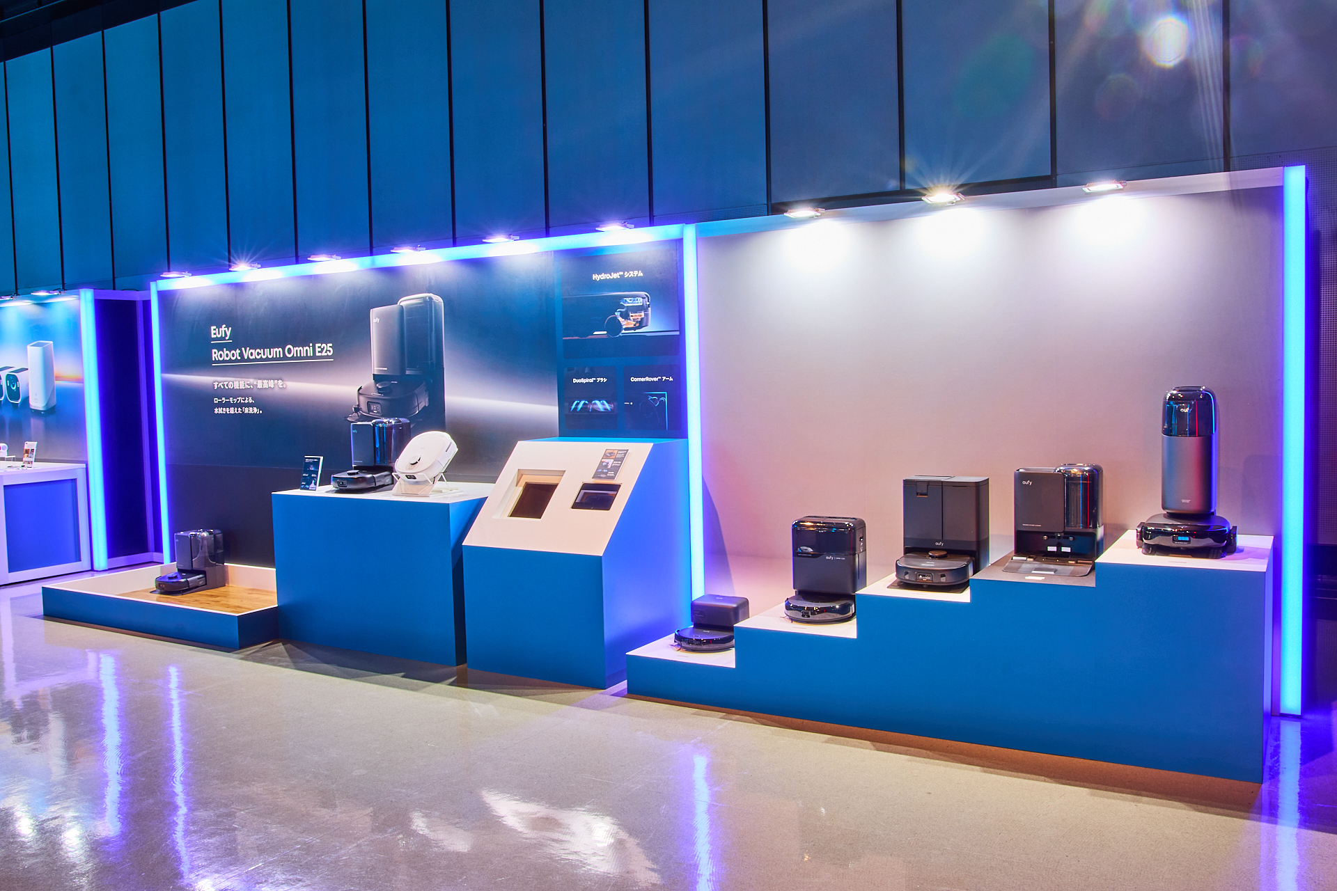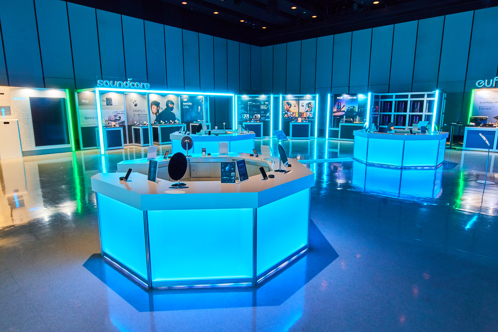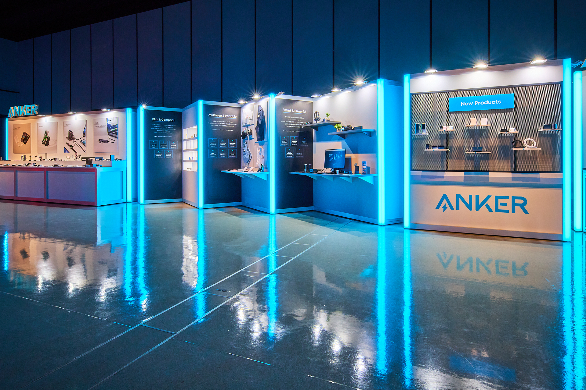 Ankerグループの多彩なブランドを紹介するブースと共に、会場中央にはキービジュアルを立体的に表現する光のシンボル展示を設置した。
