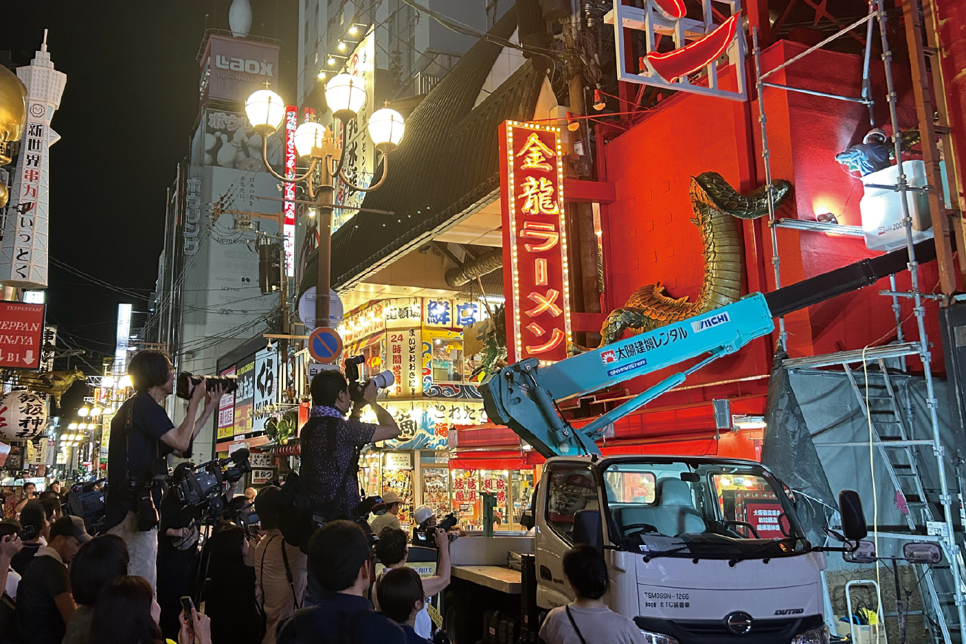 立体看板が街の文化・観光資源として根づくエンターテインメントの街として知られている大阪・道頓堀。その道頓堀の老舗「金龍ラーメン」の龍の立体看板もその象徴の一つであったが、しっぽ部分が隣接地にはみ出しているとして法的に撤去が確定し、2024年8月に実際の切除が行われた事案が発生した。
