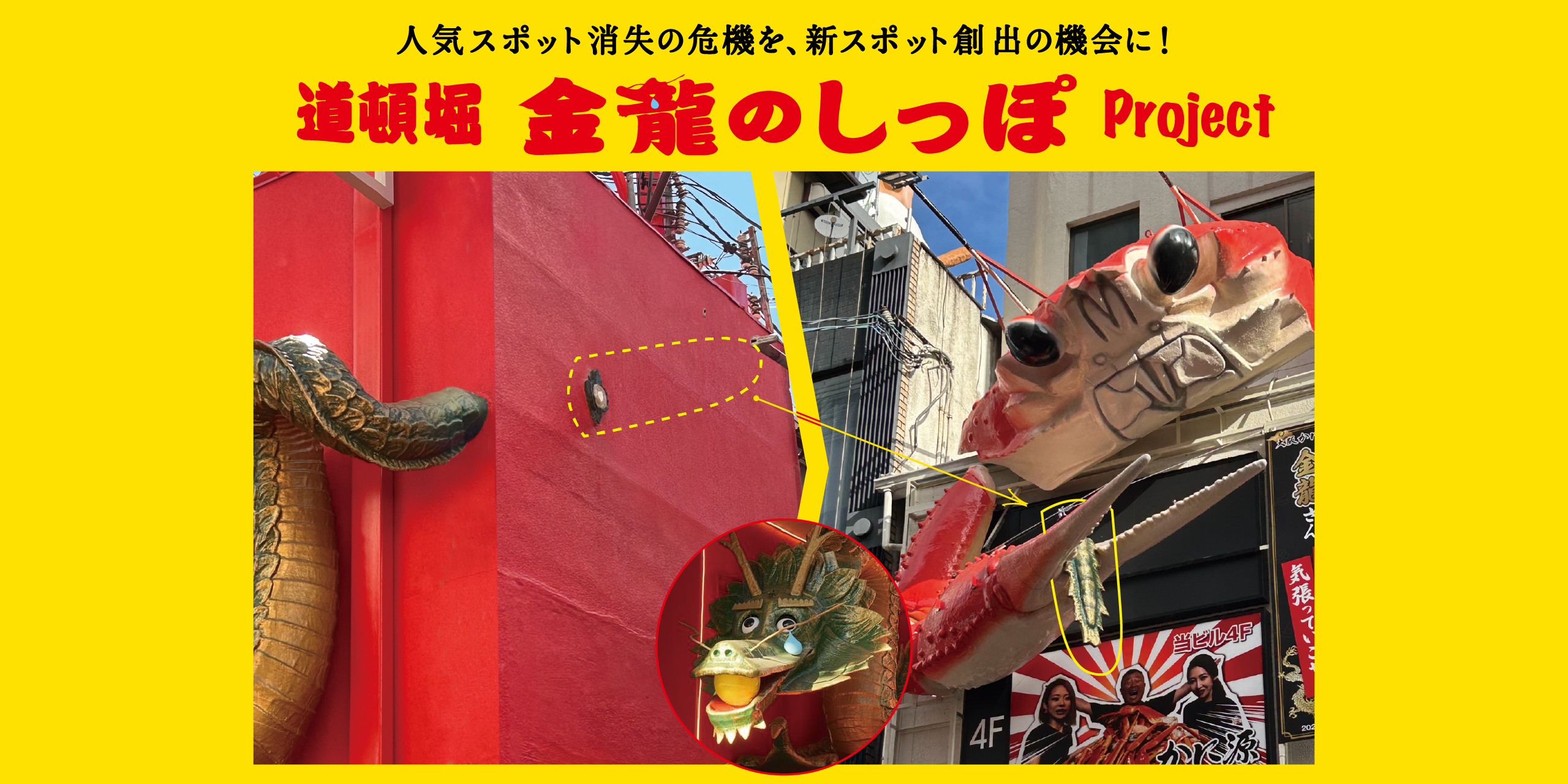 はみ出して切断することになった“しっぽ痕”に「涙」の装飾を加えたり、切除された“しっぽ”を近隣のかに料理店の巨大かに看板に“挟ませる”といったコラボレーション企画の看板演出をしたりと、大阪らしいユーモラスなストーリーとして昇華。道頓堀発の明るいニュースとして再定義し、SNSおよび各種メディア露出を通じて全国的な話題化に成功し、カンヌライオンズ、ACC TOKYO CREATIVITY AWARDS、大阪広告協会賞、PRアワードをはじめ、国内外の主要広告賞で高い評価を獲得した。