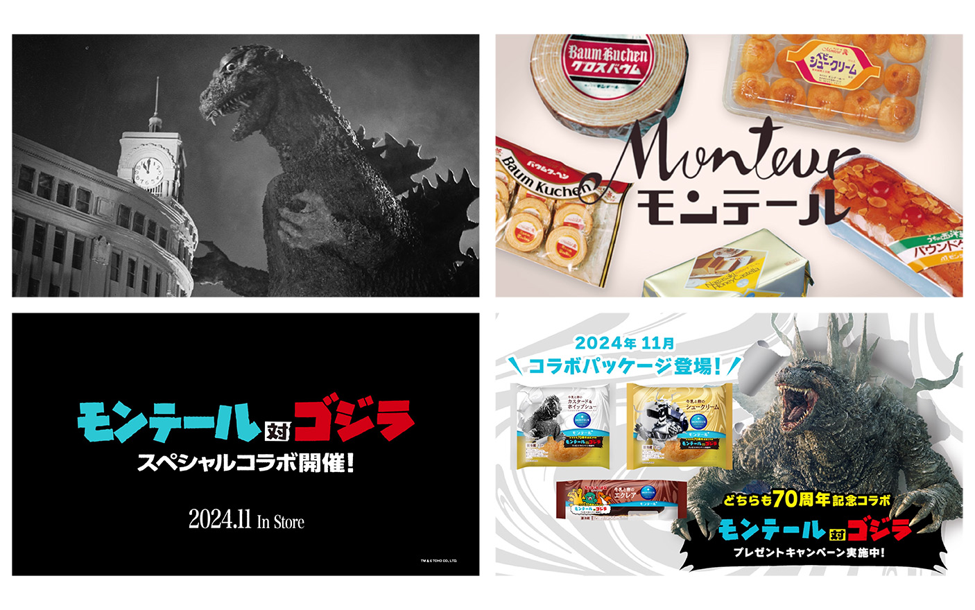 洋生菓子を製造・販売する株式会社モンテールの創業70周年施策として、同じく2024年に70周年を迎え、幅広い世代から愛され続けられてきた「ゴジラ」とコラボ。周年記念特別施策として「モンテール対ゴジラ」を企画・実施した。